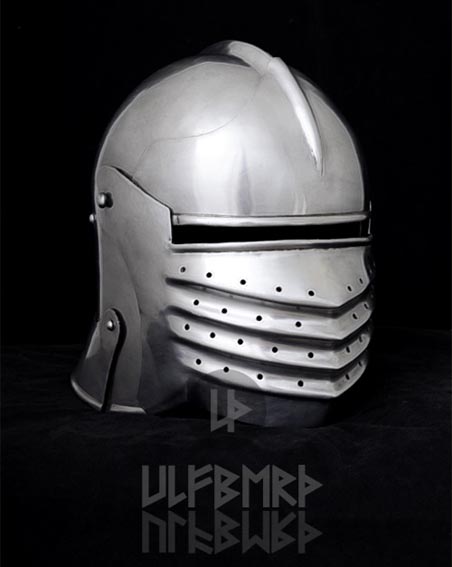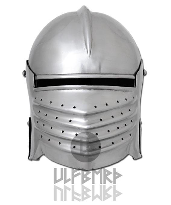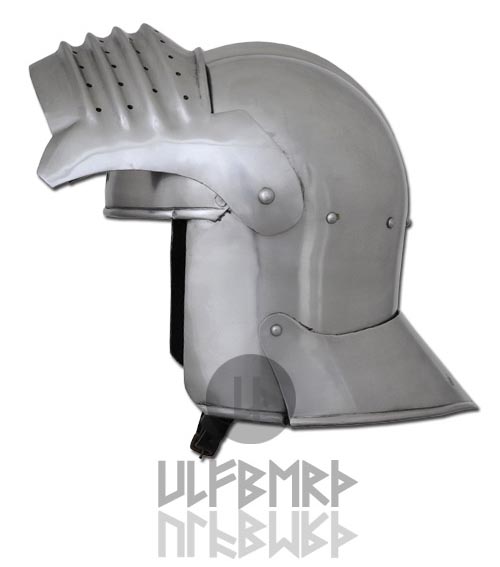 Aufgrund seiner ungewöhnlichen Visierform wird dieser Helm Blasebalg-Schaller genannt.