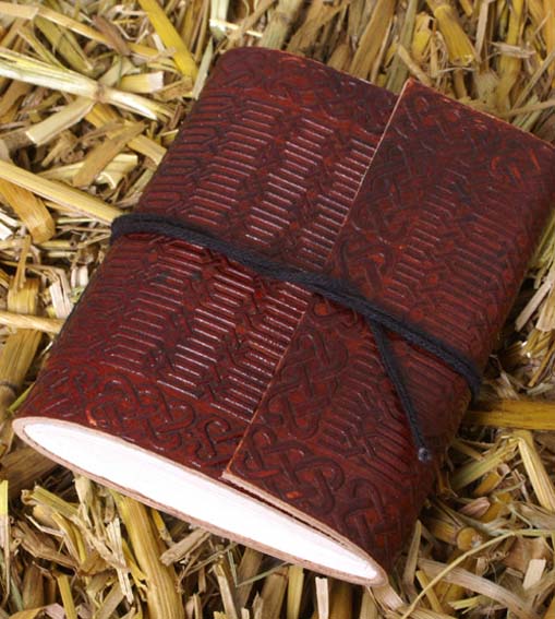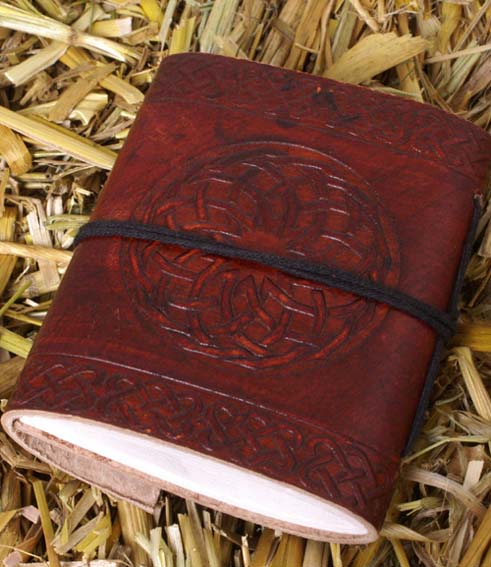 Das Lederbuch hat eine Reliefprägung mit keltischem Sonnenmotiv.