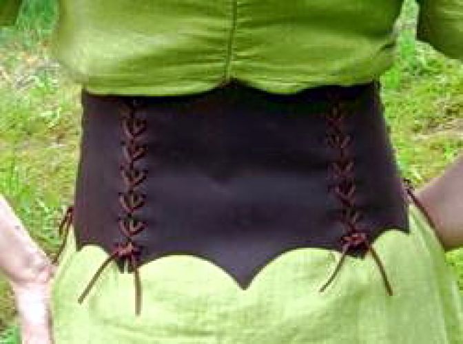 Geschlossen wird das Schnürmieder mit einem Leder-Band auf der mit Ösen versehenen Vorderseite des Mieders.