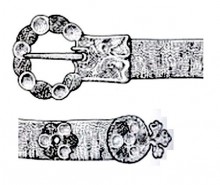 Er ist mit einer Riemenspitze und drei Ziernieten bestückt, beidseitig sind Zierlinien angebracht.