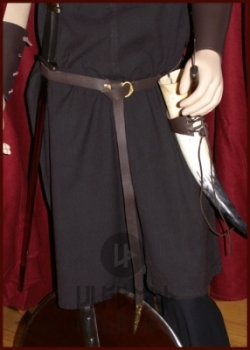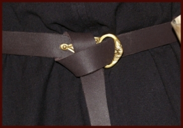 Frühmittelalterlicher Ledergürtel aus braunem Spaltleder mit authentischer Messingschnalle und Endbeschlag.