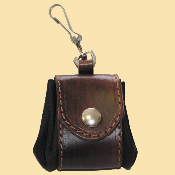 Der kleine braune Lederbeutel besitzt einen Druckknopfverschluss.