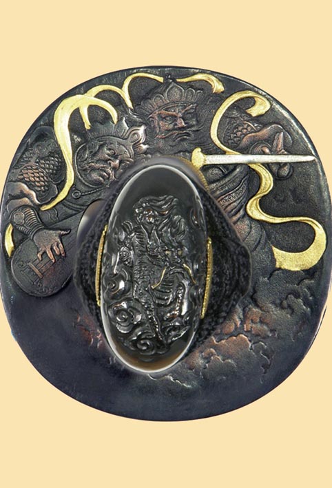 Die Tsuba, welche die Wächtergeister der Shinto-Religion (Kami) zeigt,