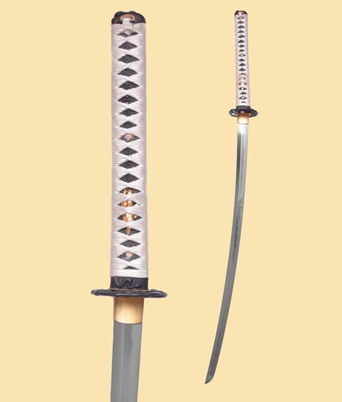 Dieses Katana besitzt eine schwarz-weiße Montur und