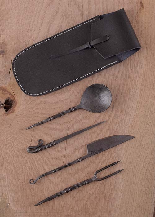 Handgeschmiedetes Essbesteck, vierteilig mit Ledertasche