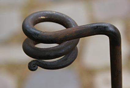 Die Fackelaufnahme ist aufwendig ausgeschmiedet und an der Spitze in Schneckenform eingerollt.