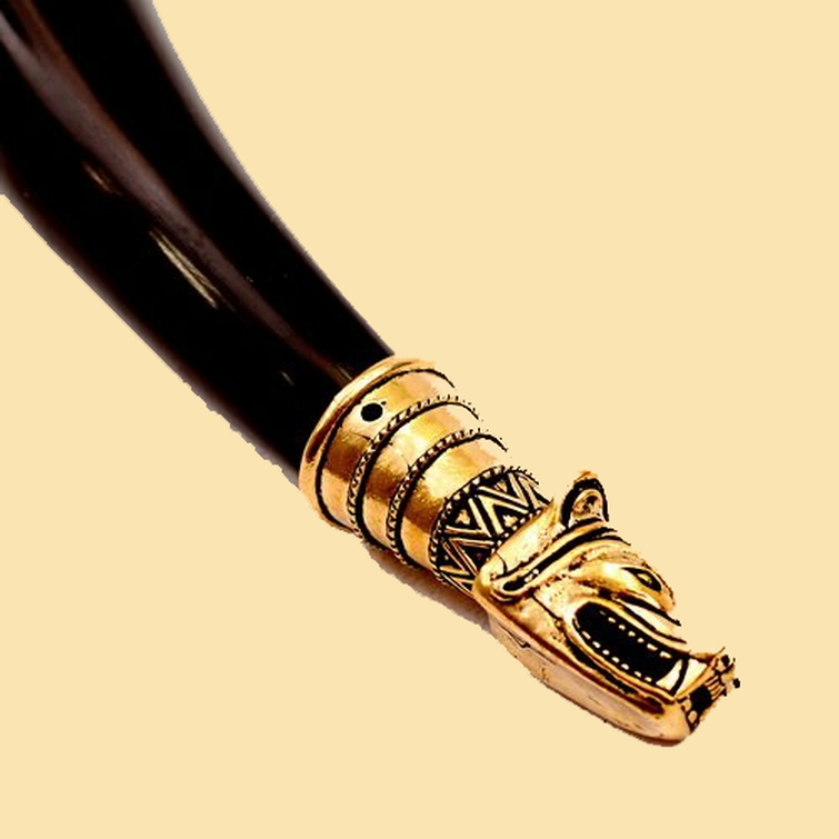 Replik einer mittelalterlichen Trinkhorn-Spitze mit Wolfskopf aus Schottland.