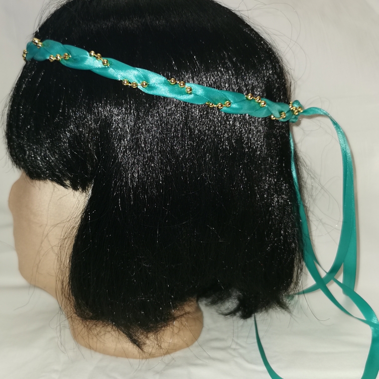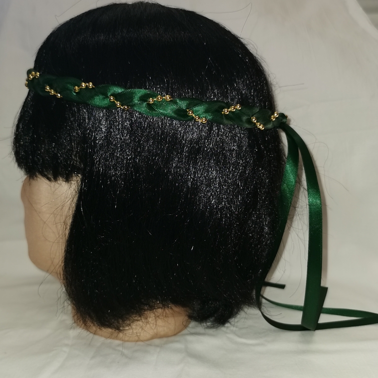 Aus Bändern geflochtener Kopfschmuck für die Dame.