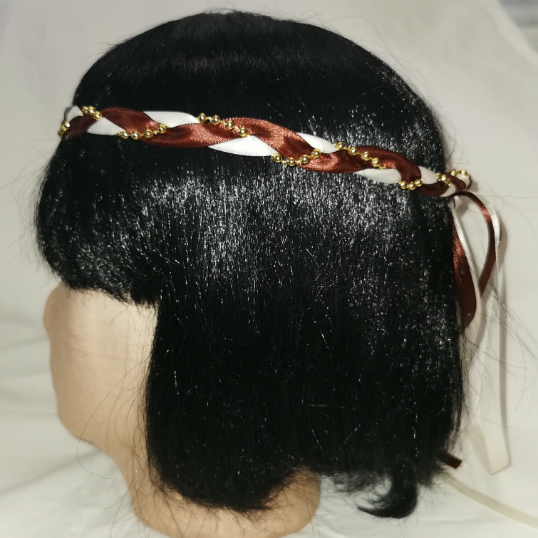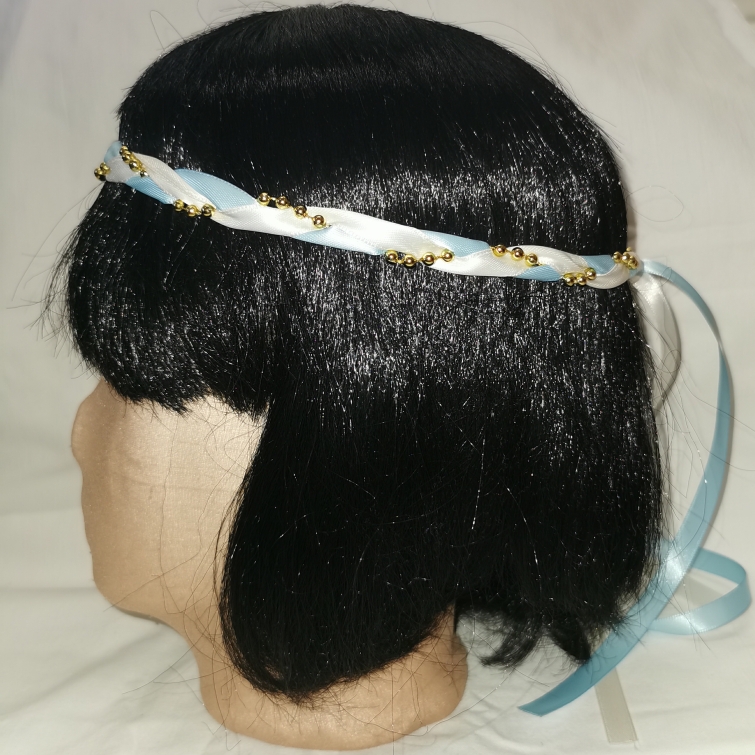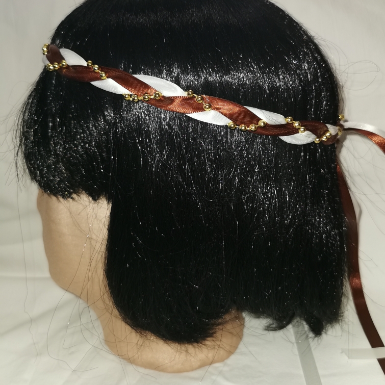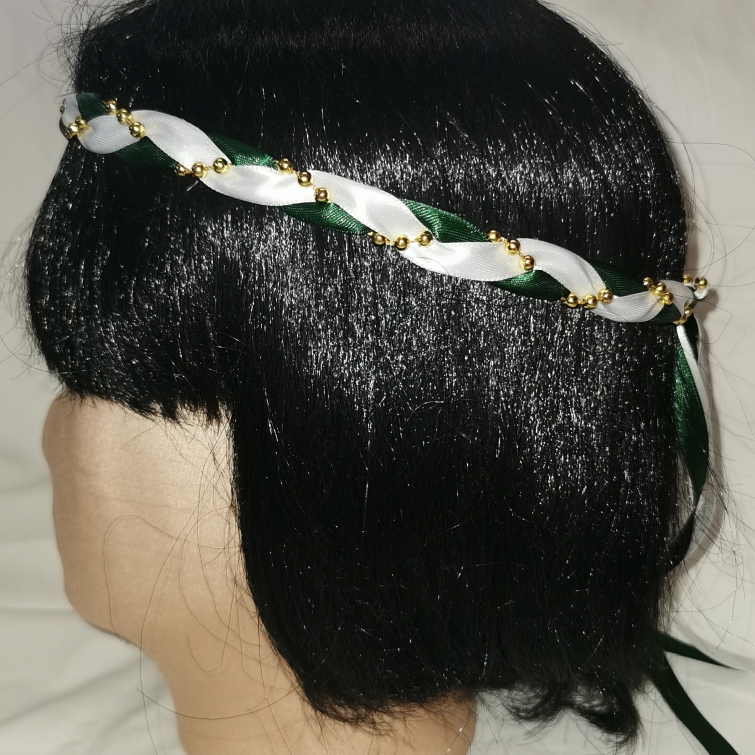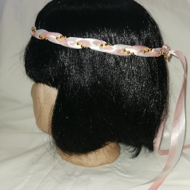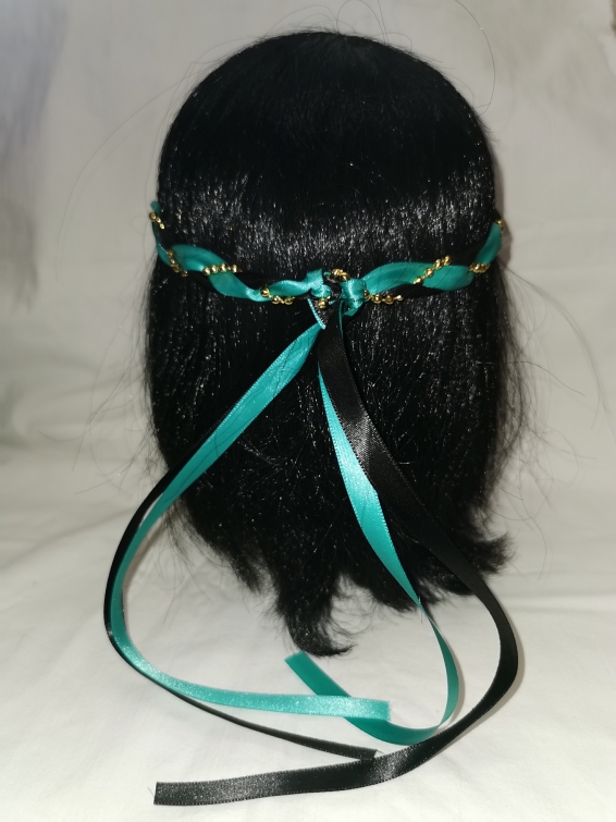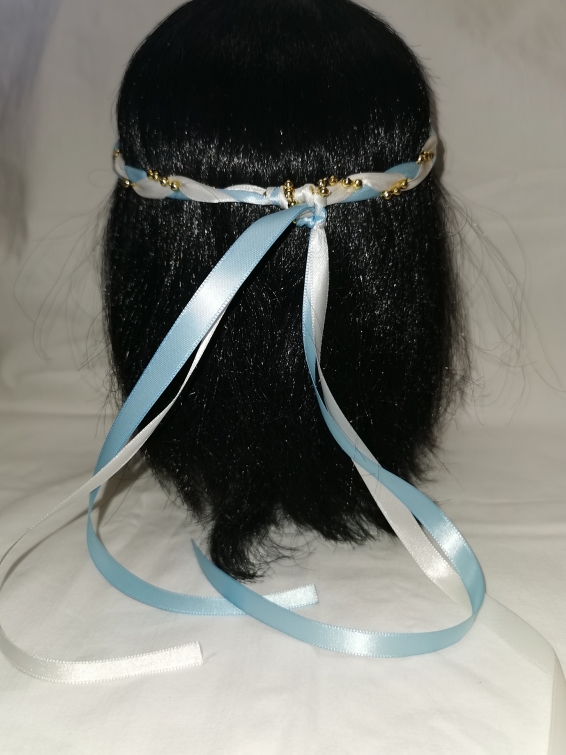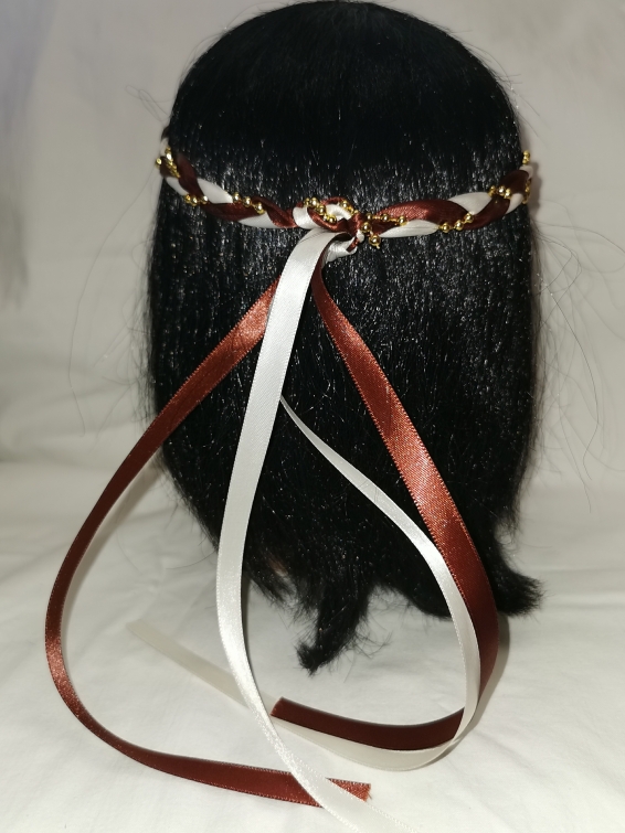 Aus Bändern geflochtener Kopfschmuck für die Dame.
