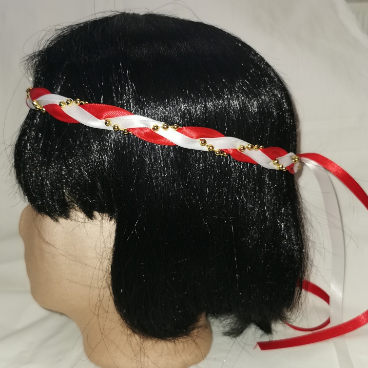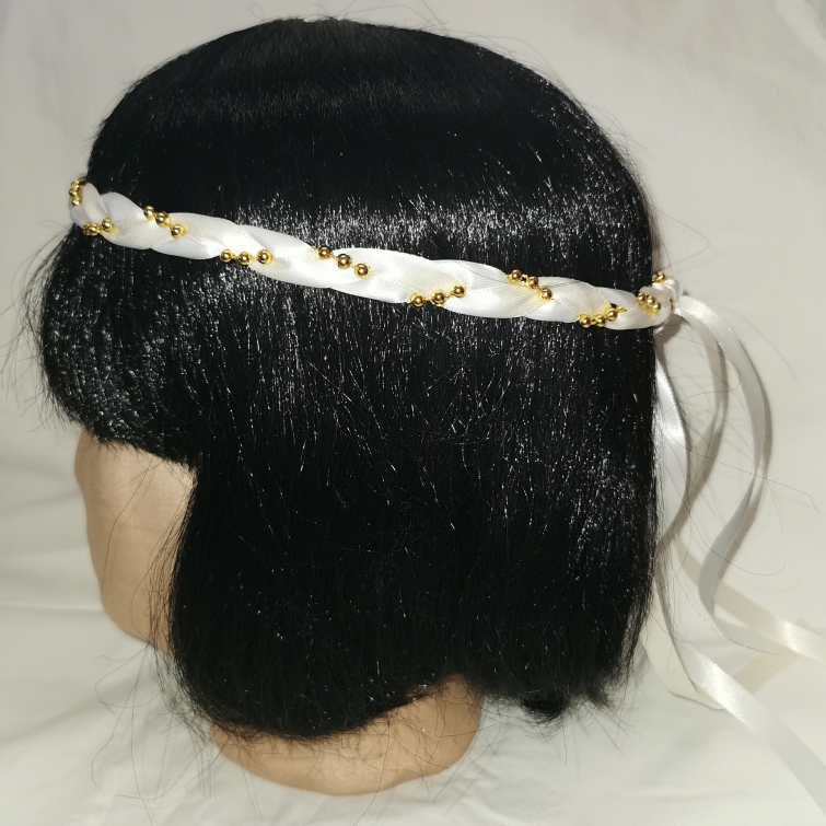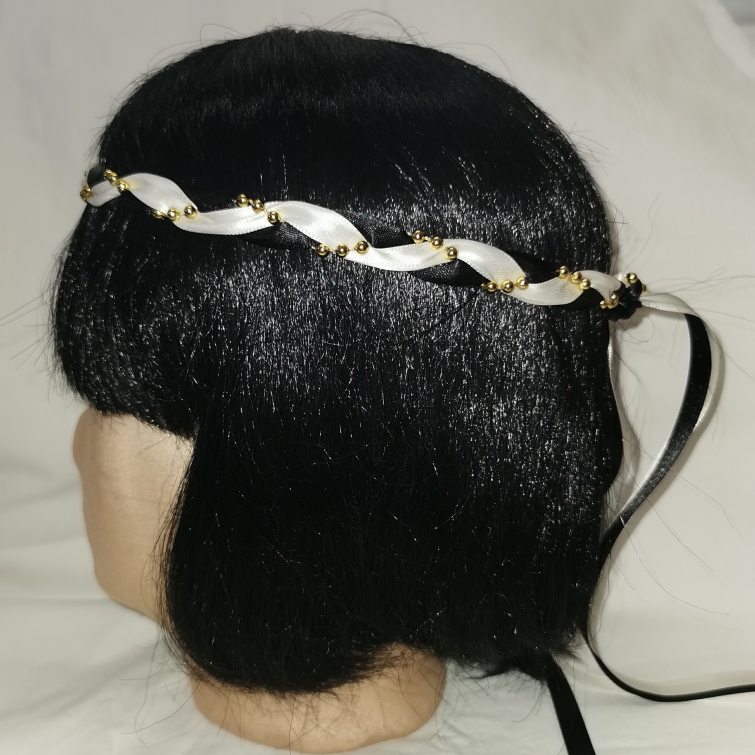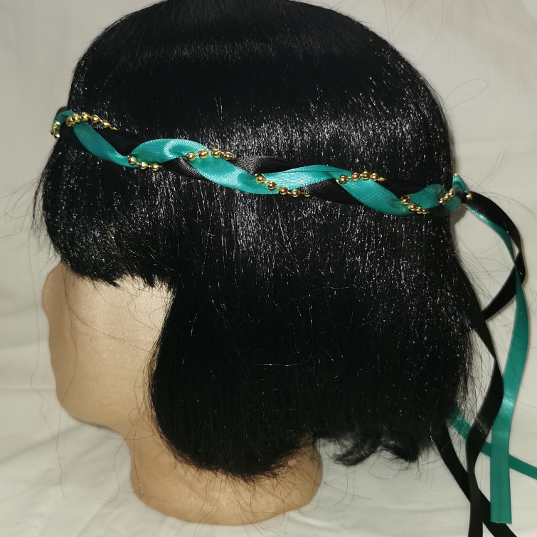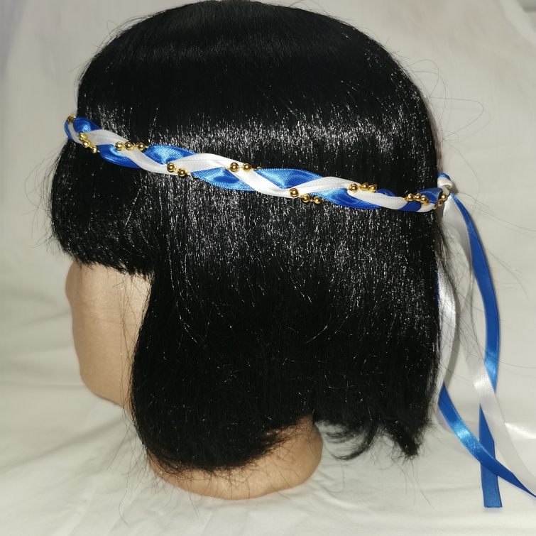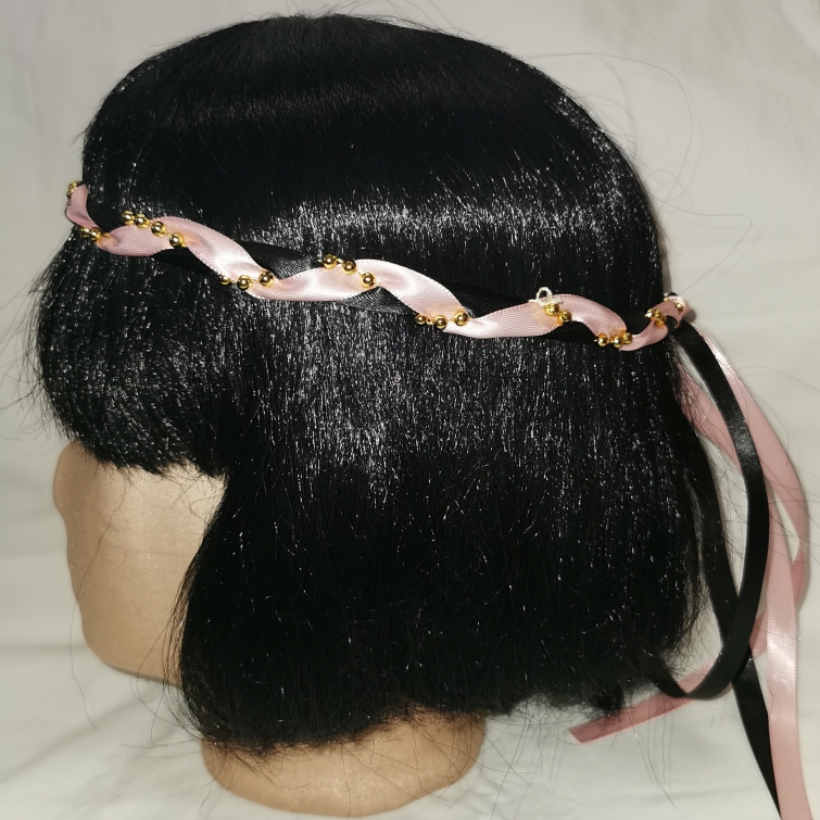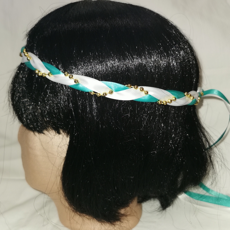 Aus Bändern geflochtener Kopfschmuck für die Dame.