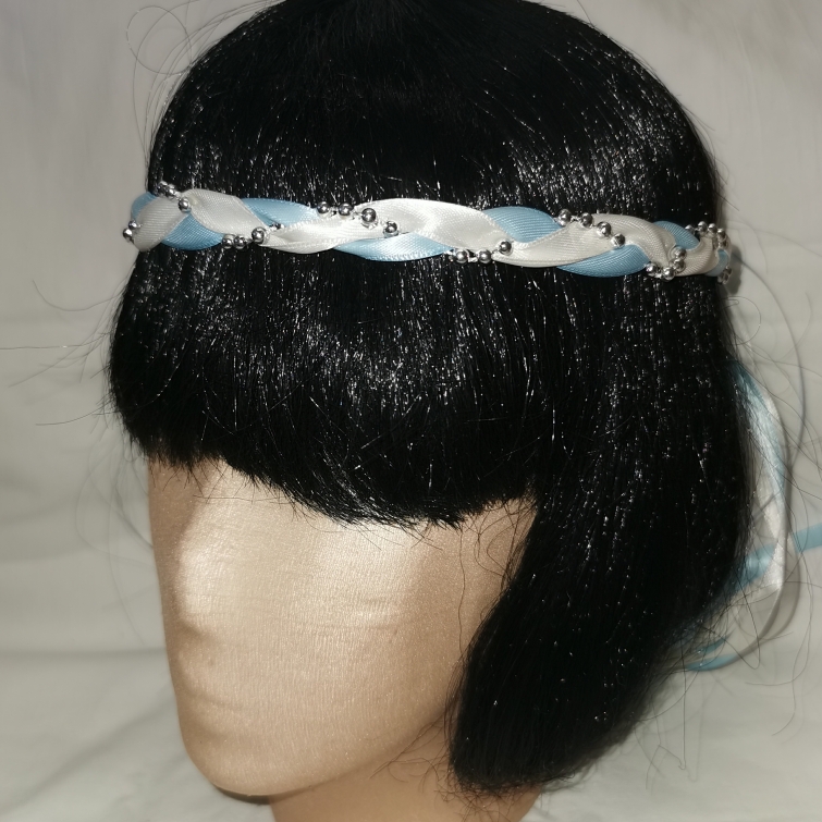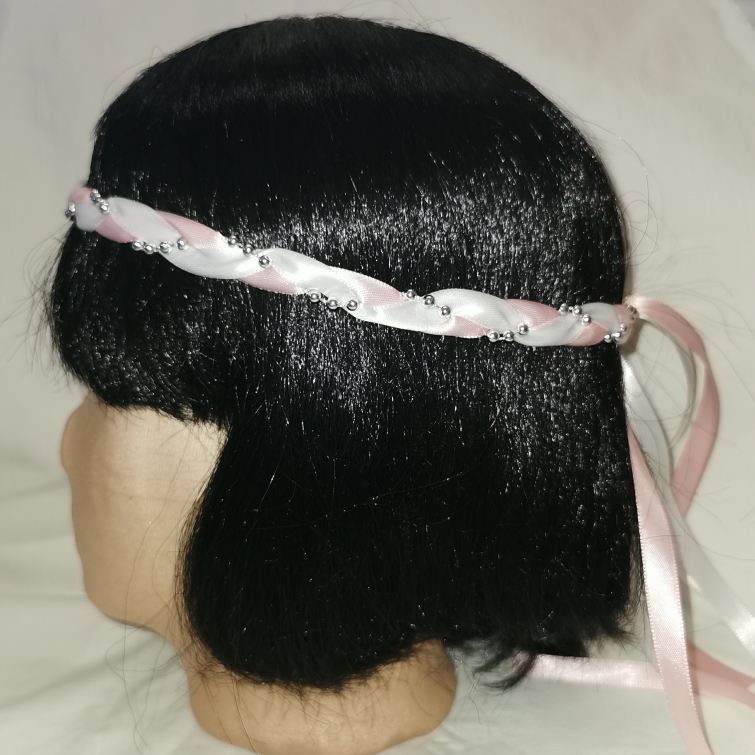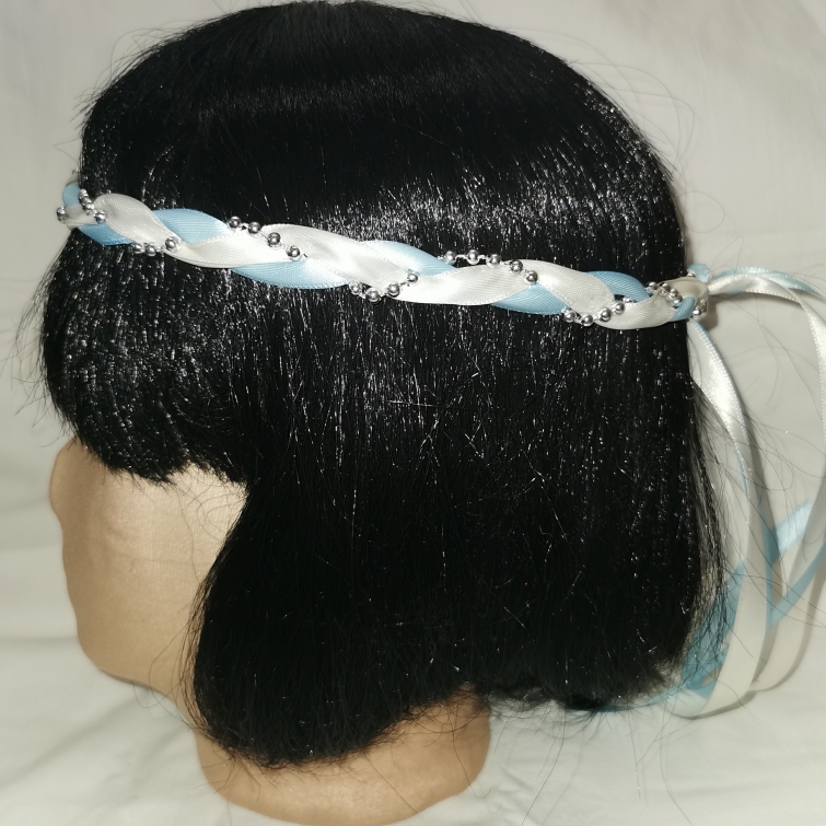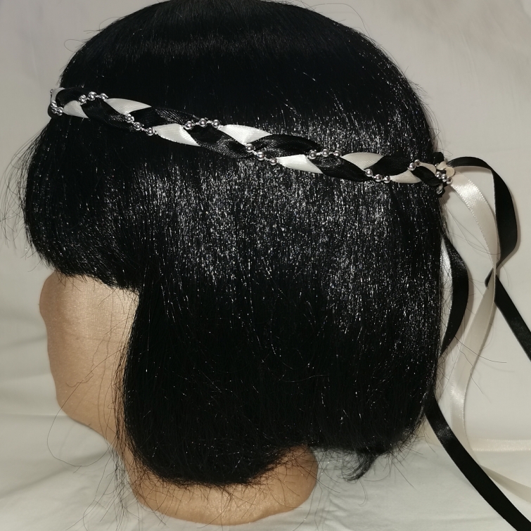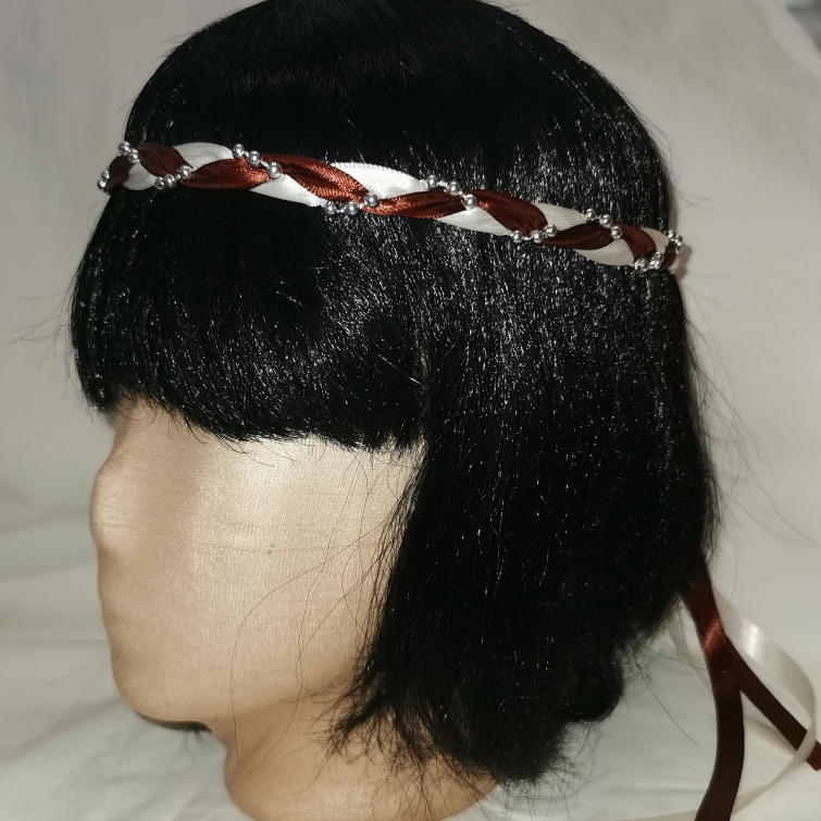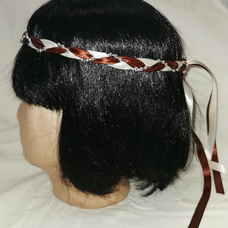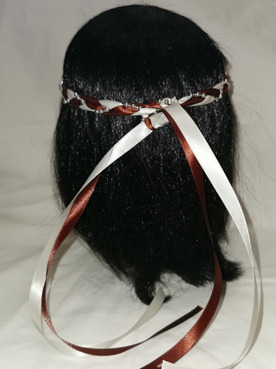Aus Bändern geflochtener Kopfschmuck für die Dame.