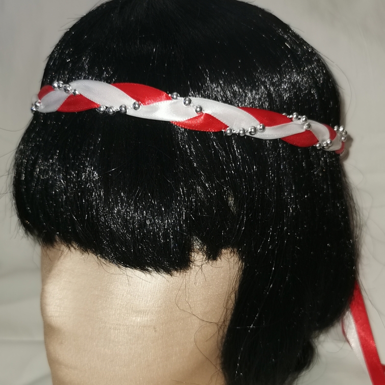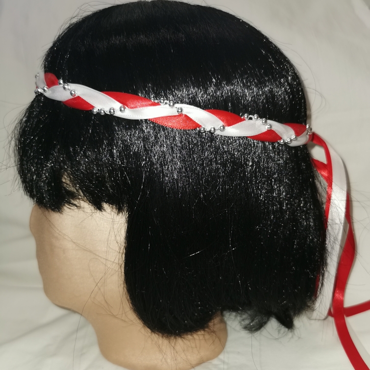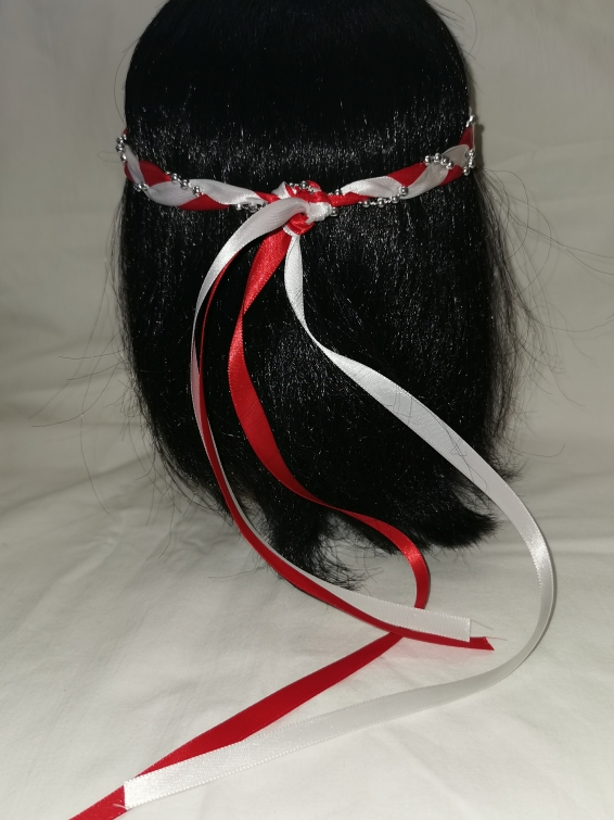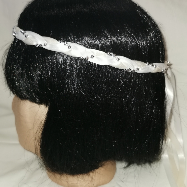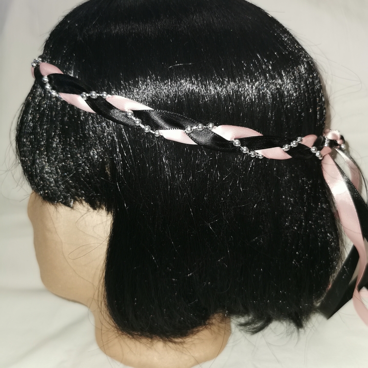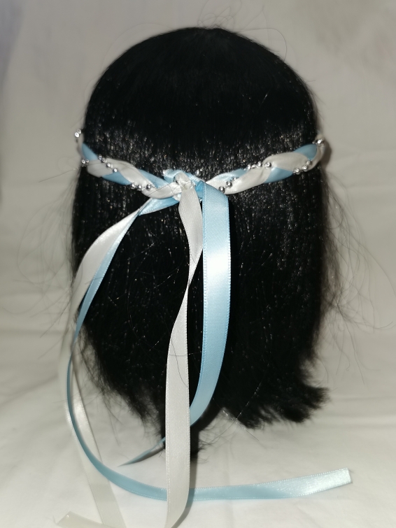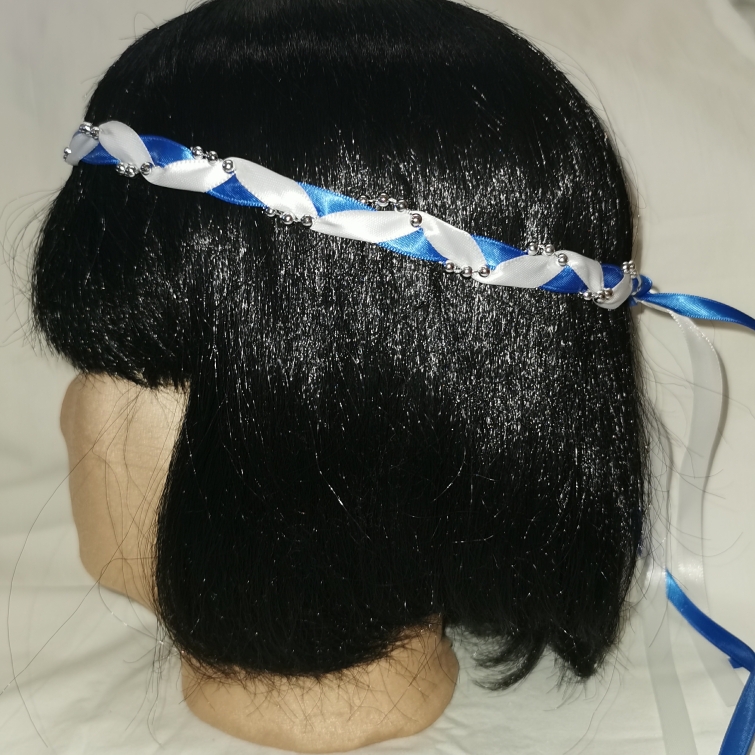 Aus Bändern geflochtener Kopfschmuck für die Dame.