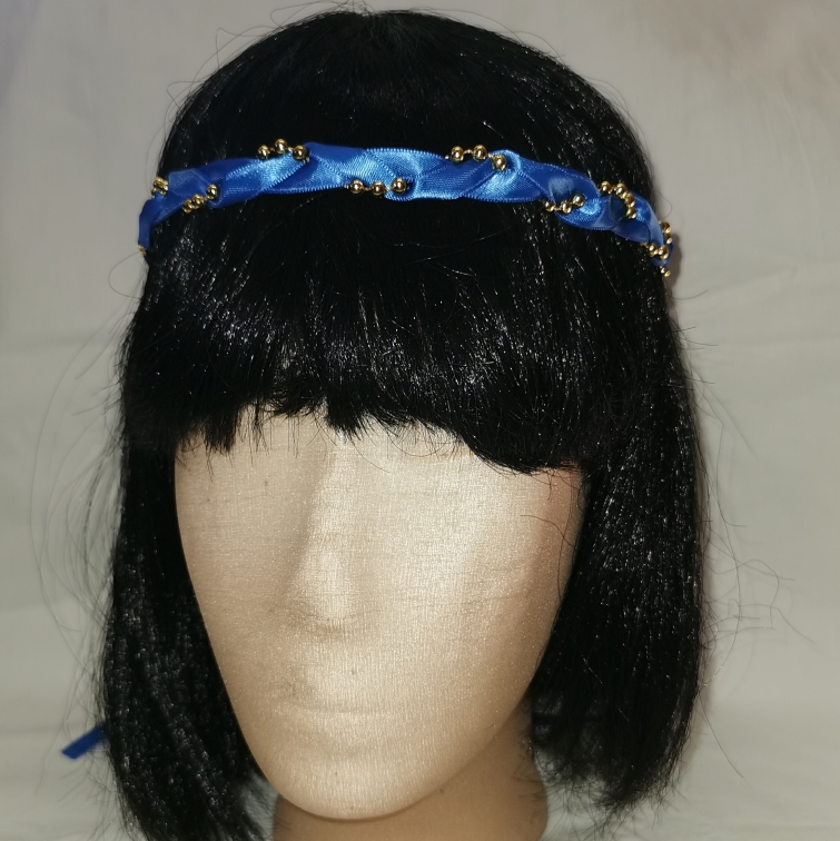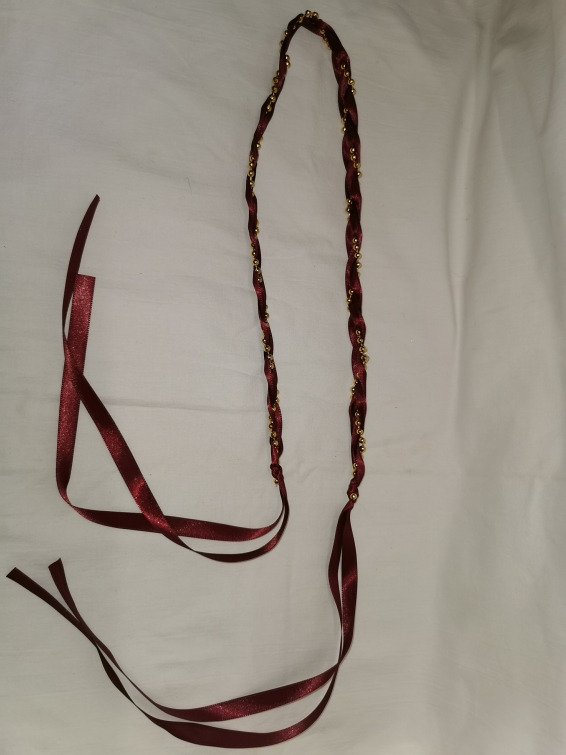 Aus Bändern geflochtener Kopfschmuck für die Dame.
