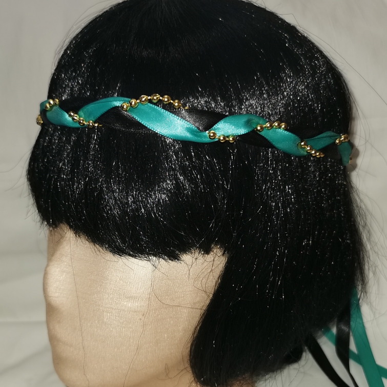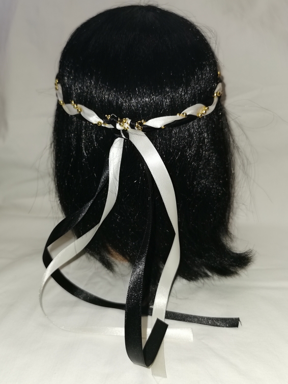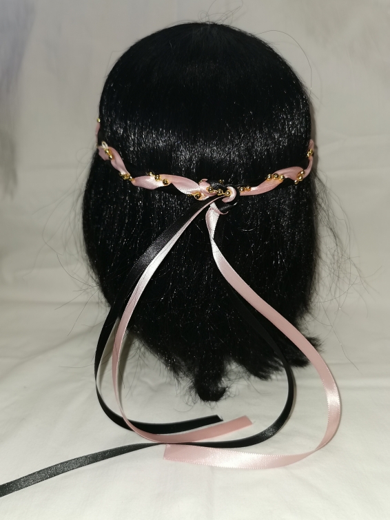 Aus Bändern geflochtener Kopfschmuck für die Dame.