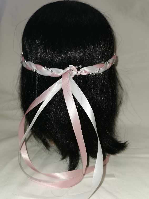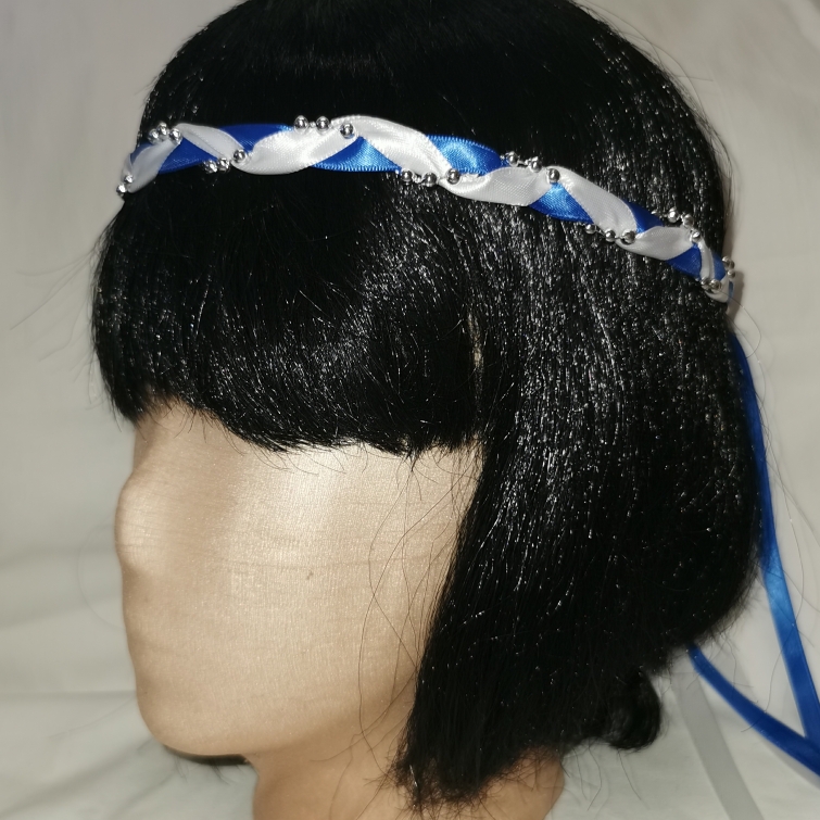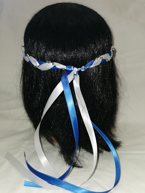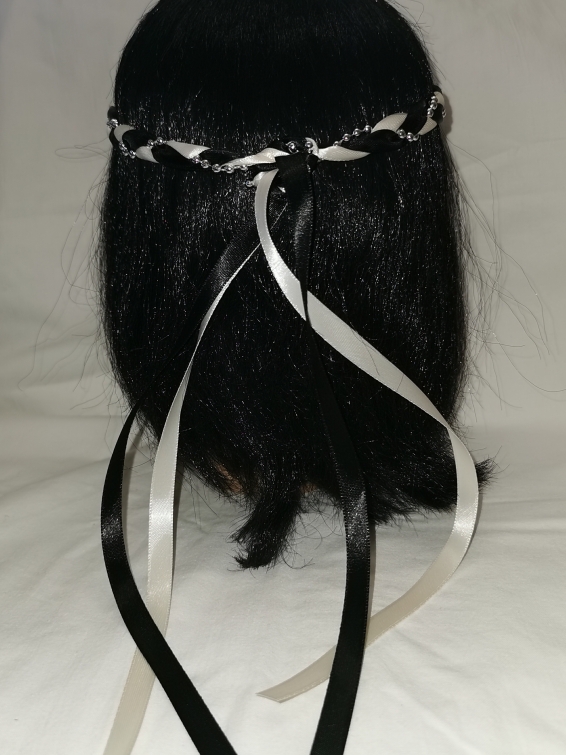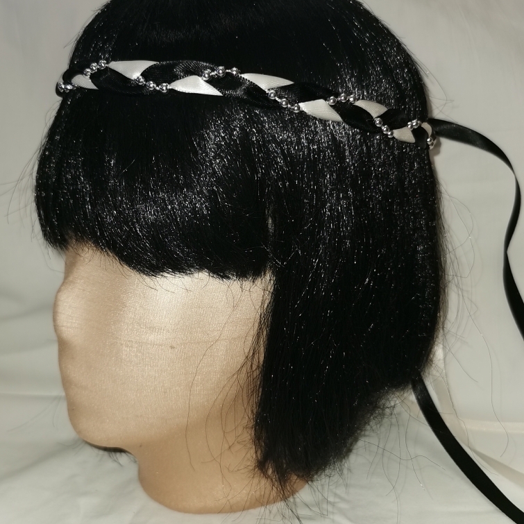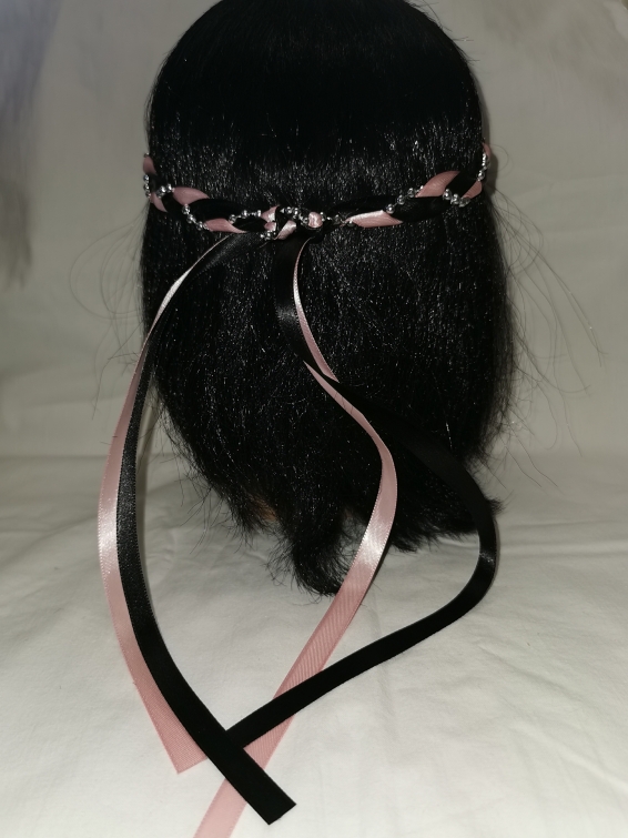 Aus Bändern geflochtener Kopfschmuck für die Dame.