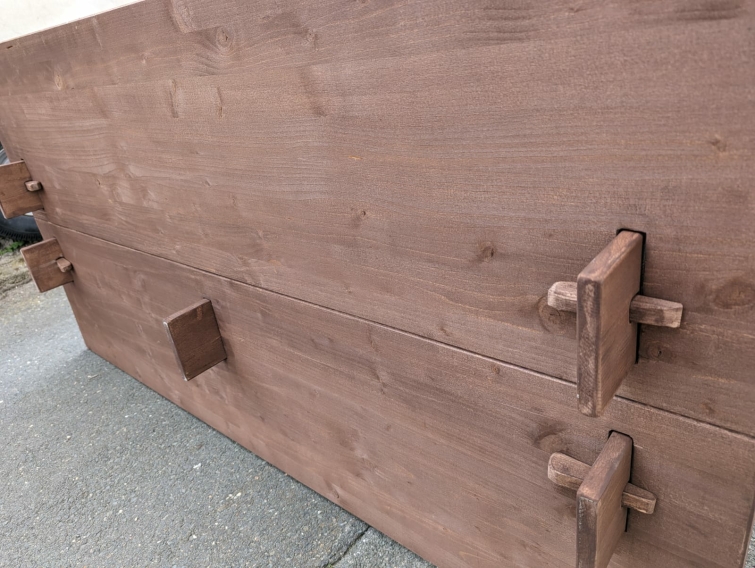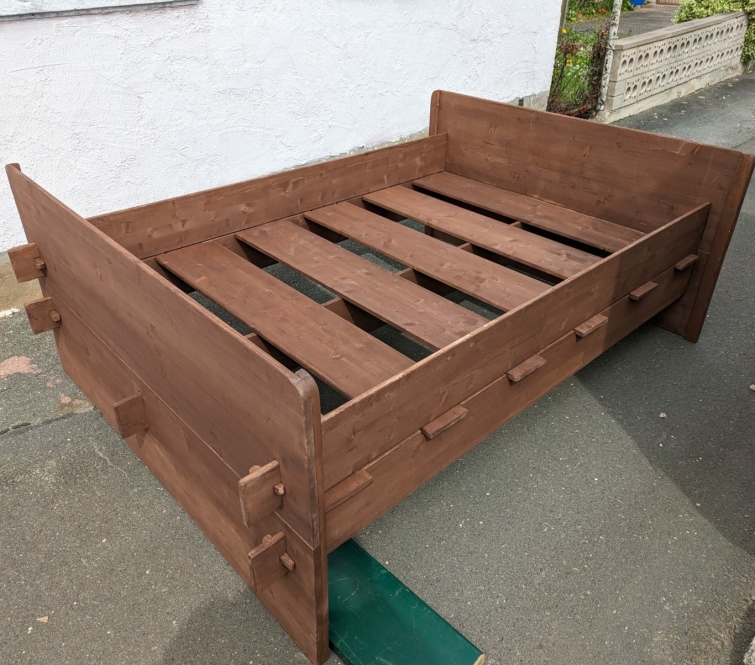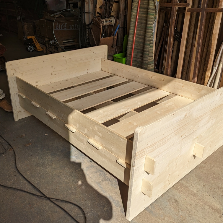 Die Betten bestehen aus Naturholzbrettern, die wahlweise naturbelassen, mit durchsichtiger Lasur oder brauner Lasur eingelassen sind. Liegefläche ca. 200 cm auf 140 cm (Doppelbett) Rahmengröße: ca. 220 auf 160