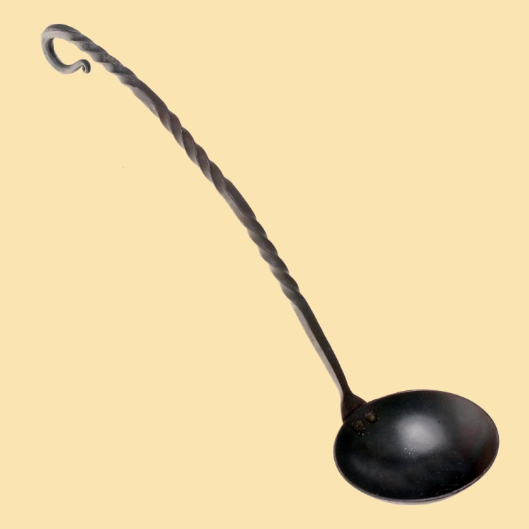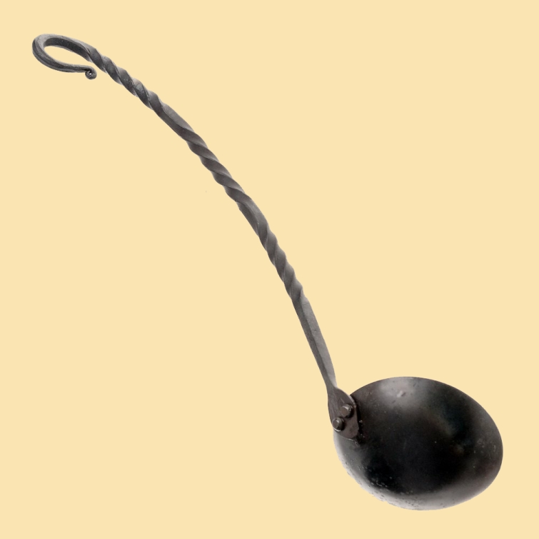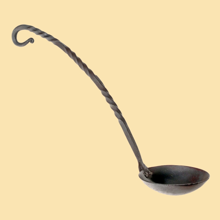 Der Stiel der Kelle ist tordiert und am Ende zu einem Haken geschmiedet.
