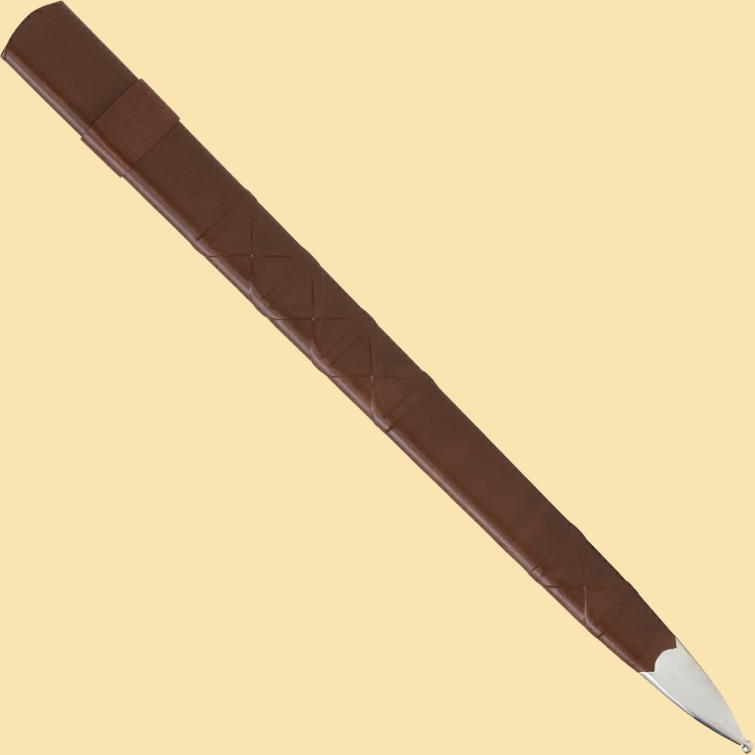 Die Scheide ist aus Holz mit Lederüberzug und Metallbeschlägen.