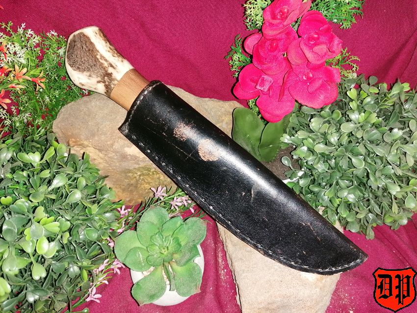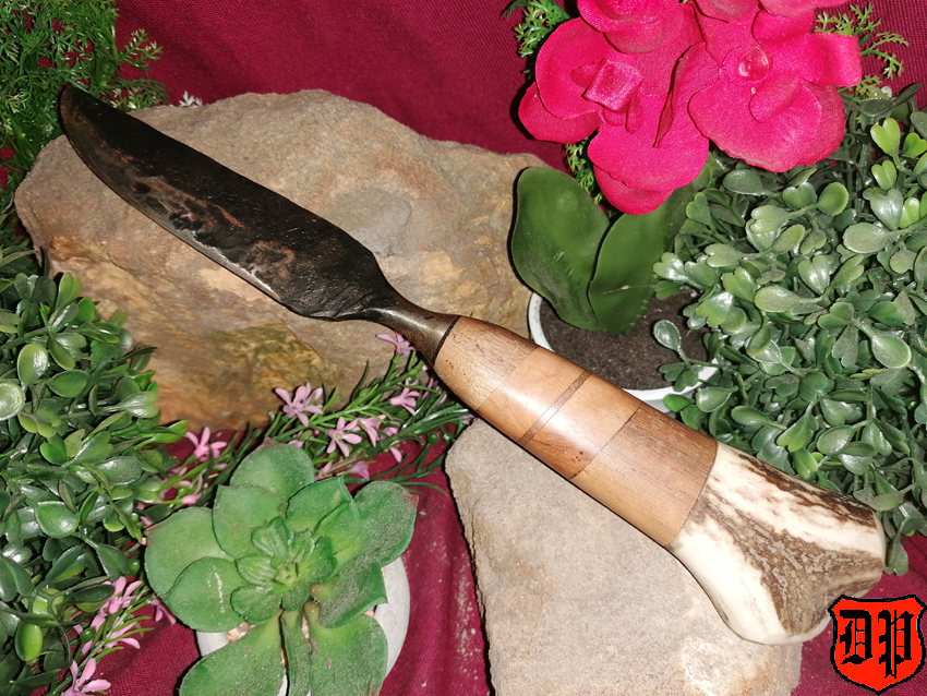 Der Griff wurde ebenfalls in Handarbeit hergestellt und besteht Geweih und Hartholz.