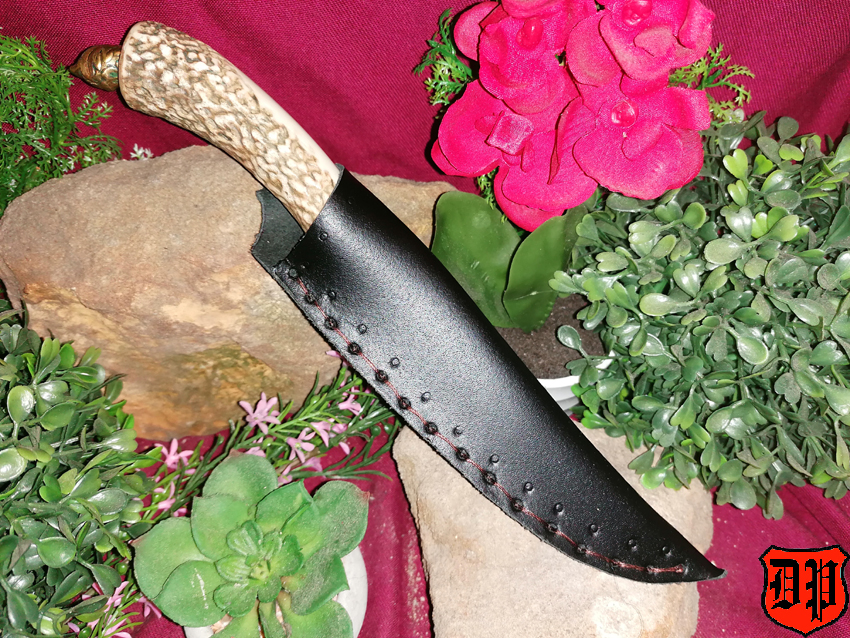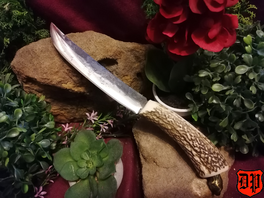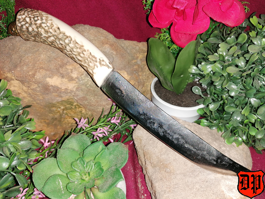 Der Griff wurde ebenfalls in Handarbeit hergestellt und besteht aus Geweih und Messing.