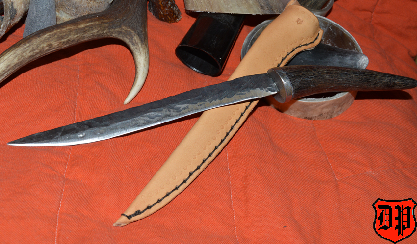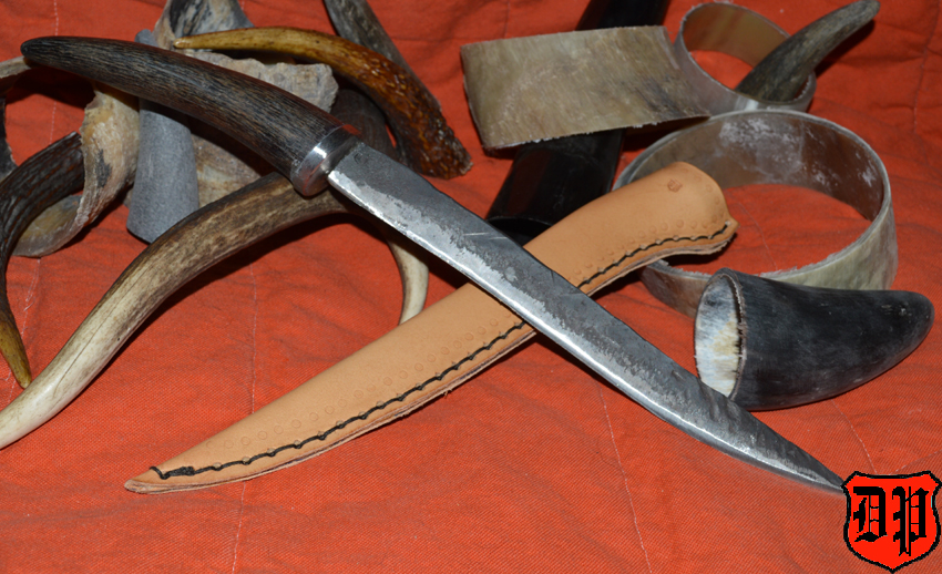 Die Klinge wurde per Hand aus Federstahl geschlagen und anschließend in Öl gehärtet.