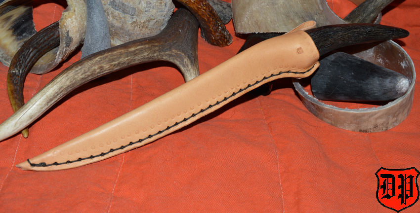 Die mitgelieferte und ebenfalls in Handarbeit gefertigte Messerscheide besteht aus ca. 2 mm dickem Italienischem Bullenleder.