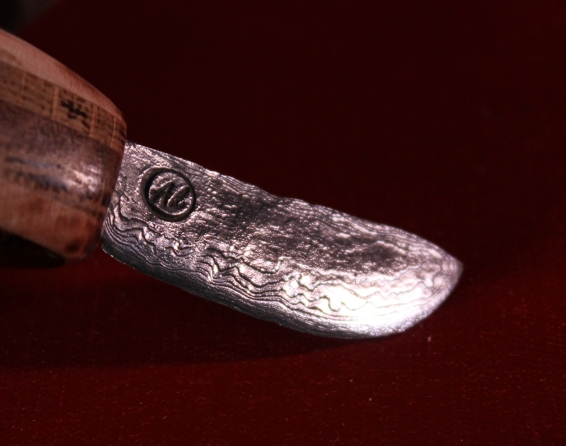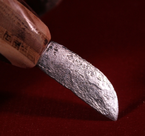 Die Klinge wurde aus 23 Lagigem Suminagashi Stahl mit einer Mittellage aus weißem Papierstahl geschlagen und anschließend in Öl gehärtet.