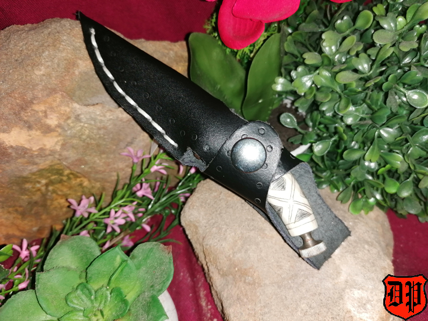 Die mitgelieferte und ebenfalls in Handarbeit gefertigte Messerscheide besteht aus ca. 2 mm dickem Italienischem Bullenleder.