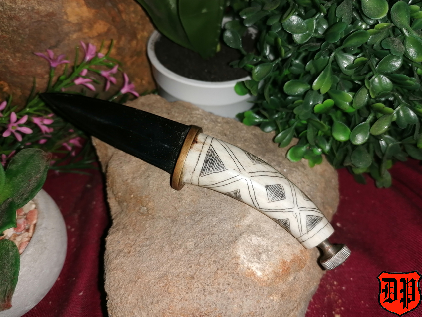 Die zweischneidige Klinge wurde per Hand aus Federstahl geschmiedet und am Ende im Öl gehärtet.