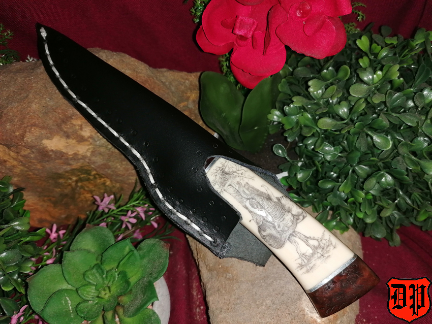 Die mitgelieferte und ebenfalls in Handarbeit gefertigte Messerscheide besteht aus ca. 2 mm dickem Italienischem Bullenleder.