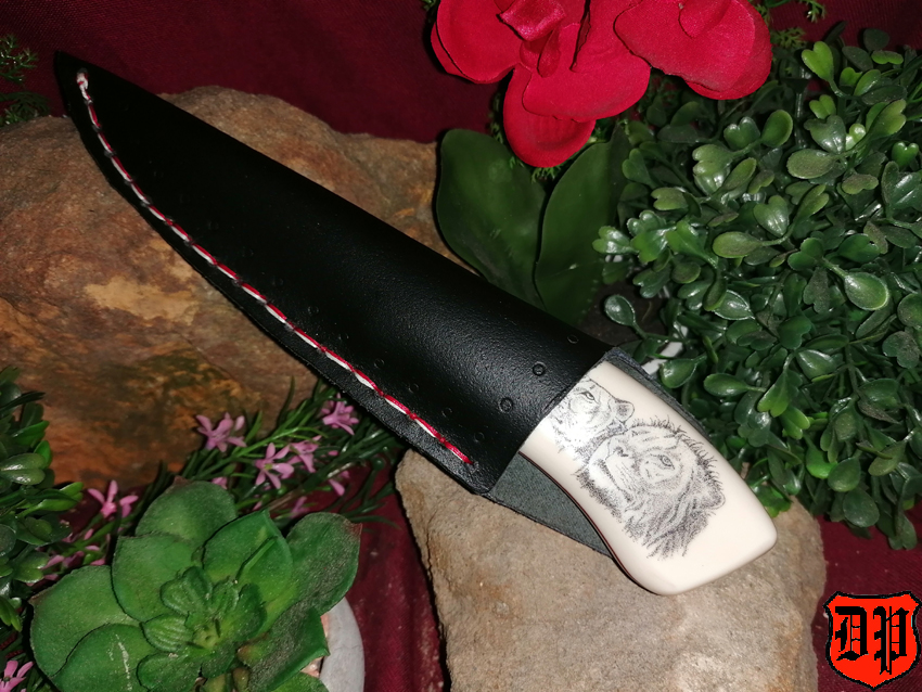 Die mitgelieferte und ebenfalls in Handarbeit gefertigte Messerscheide besteht aus ca. 2 mm dickem Italienischem Bullenleder.