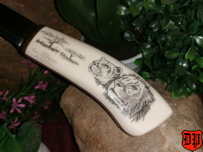 Die Scrimshaw Arbeit wurde von dem inzwischen leider verstorbenen Scrimshaw Künstler "Herrmens" eingearbeitet.