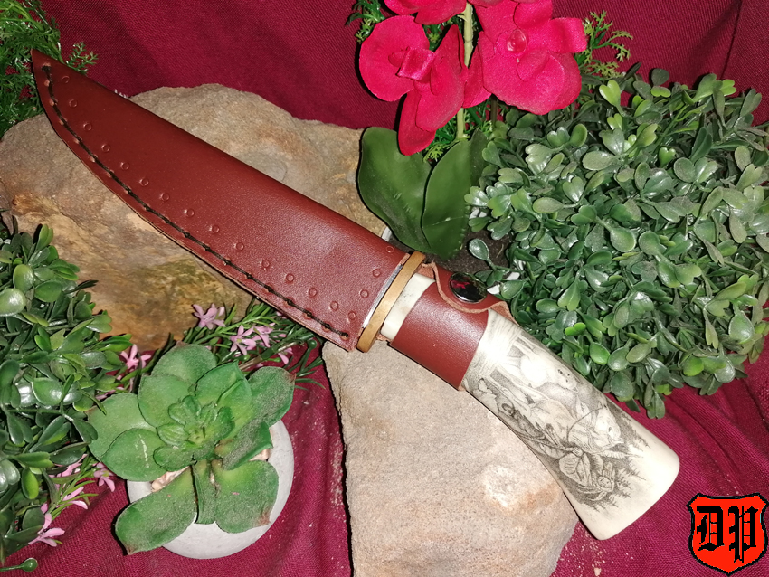 Die mitgelieferte und ebenfalls in Handarbeit gefertigte Messerscheide besteht aus ca. 2 mm dickem Italienischem Bullenleder.