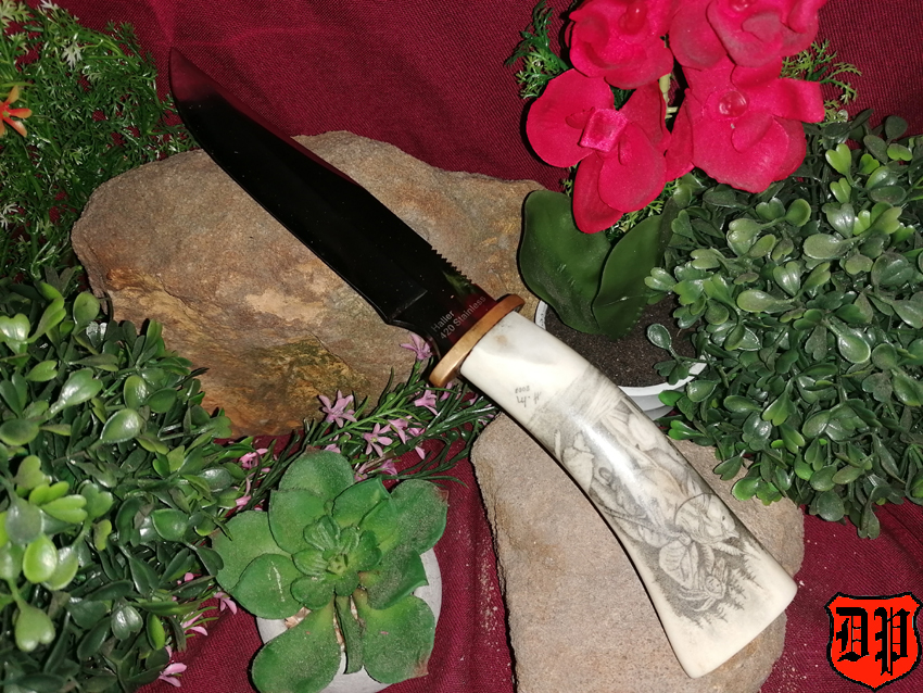 Die Scrimshaw Arbeit wurde von dem inzwischen leider verstorbenen Scrimshaw Künstler "Herrmens" eingearbeitet.