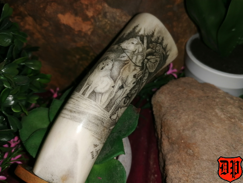 Scrimshaw ist eine fast ausgestorbene Kunst, die Ihren Ursprung bei den amerikanischen Ureinwohnern hatte. Am verbreitetsten ist die Kunst heutzutage noch in der Indianistik.