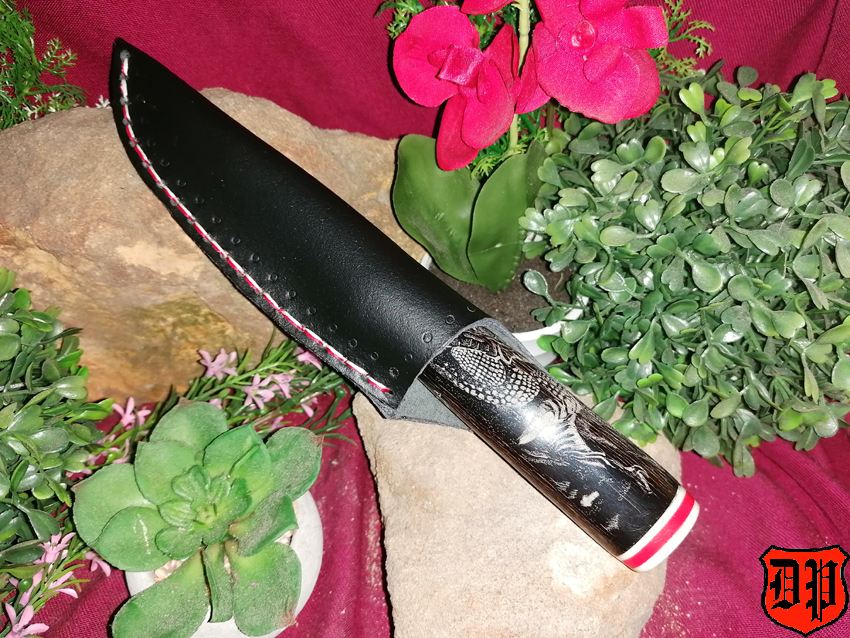 Die mitgelieferte und ebenfalls in Handarbeit gefertigte Messerscheide besteht aus ca. 2 mm dickem Italienischem Bullenleder.