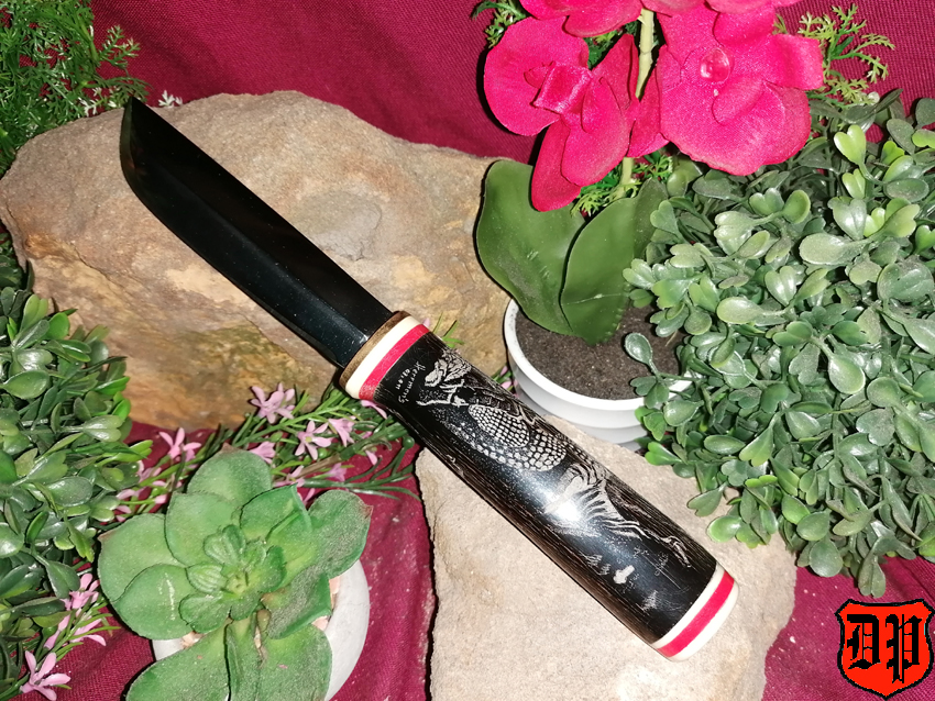 Die Klinge wurde per Hand aus Federstahl geschmiedet und am Ende im Öl gehärtet.