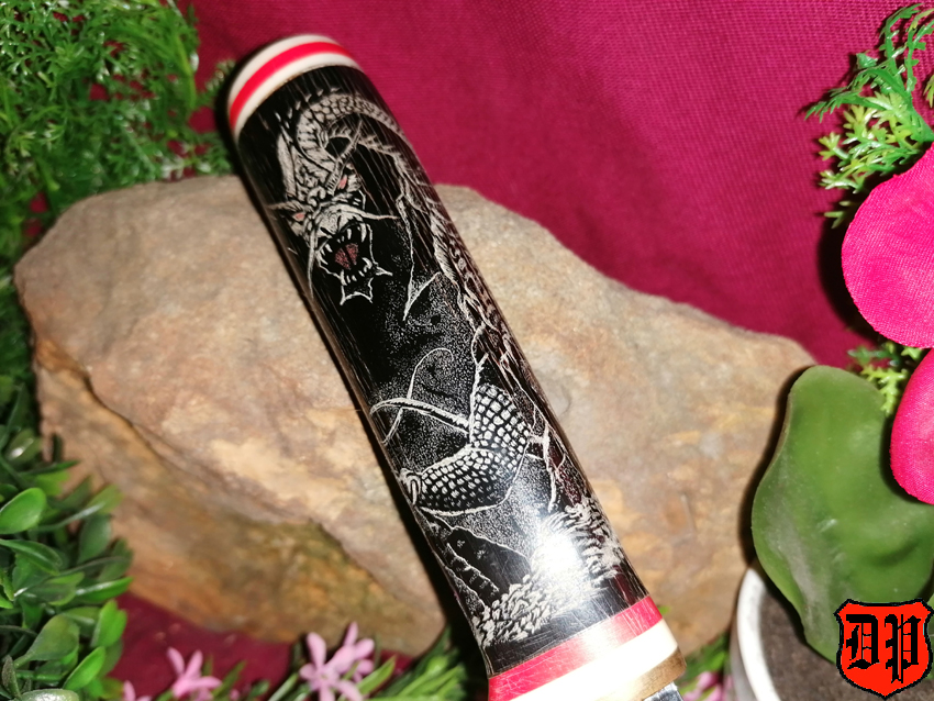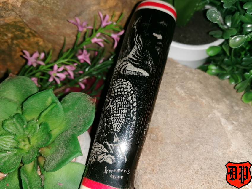 Die Scrimshaw Arbeit wurde von dem inzwischen leider verstorbenen Scrimshaw Künstler "Herrmens" eingearbeitet.