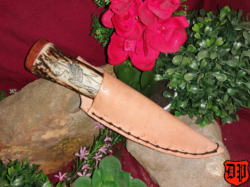 Die mitgelieferte und ebenfalls in Handarbeit gefertigte Messerscheide besteht aus ca. 2 mm dickem Italienischem Bullenleder.