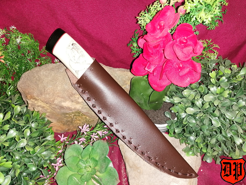 Die mitgelieferte und ebenfalls in Handarbeit gefertigte Messerscheide besteht aus ca. 2 mm dickem Italienischem Bullenleder.