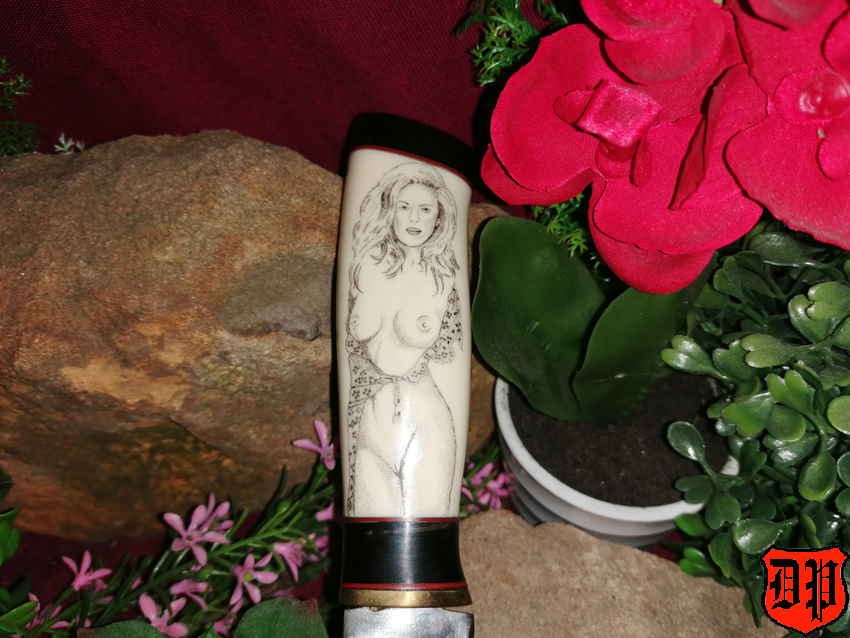 Die Scrimshaw Arbeit wurde von dem inzwischen leider verstorbenen Scrimshaw Künstler "Herrmens" eingearbeitet.