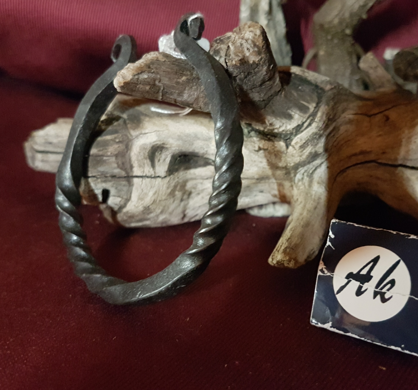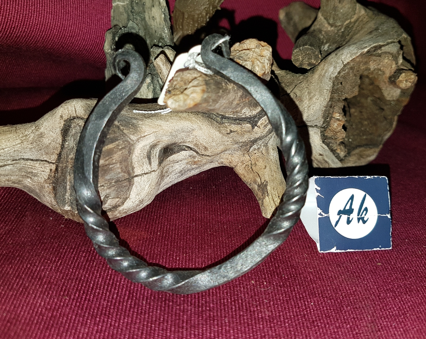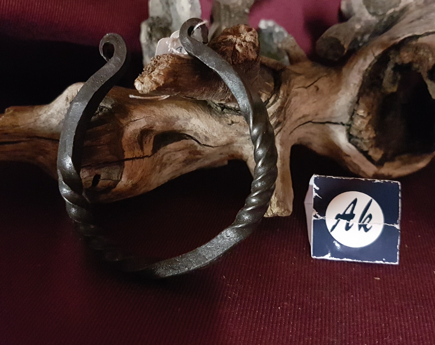 Da der Armreif frei per Hand aus dem Material geschlagen wurde und nicht wie meist aus einem Gesenk, handelt sich bei dem Produkt um ein absolutes Unikat.