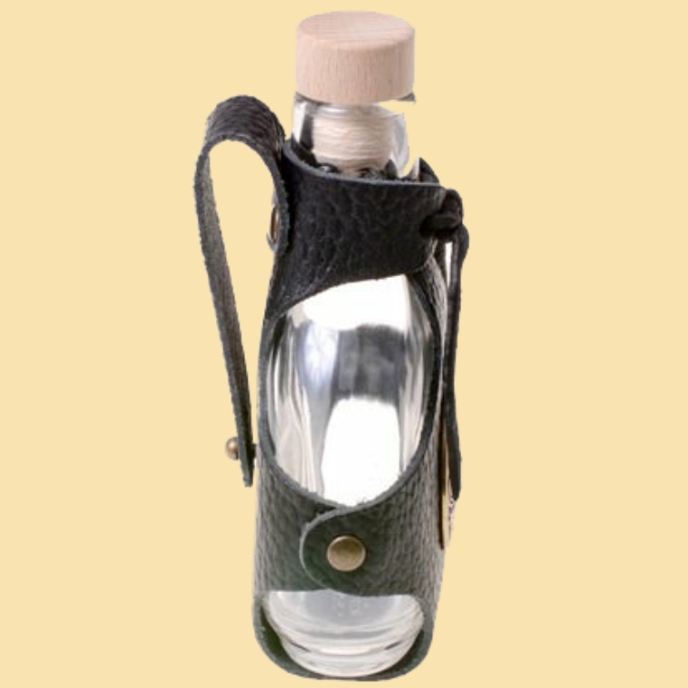 Die Glas-Feldflasche ist mit einem Halter für den Gürtel versehen.