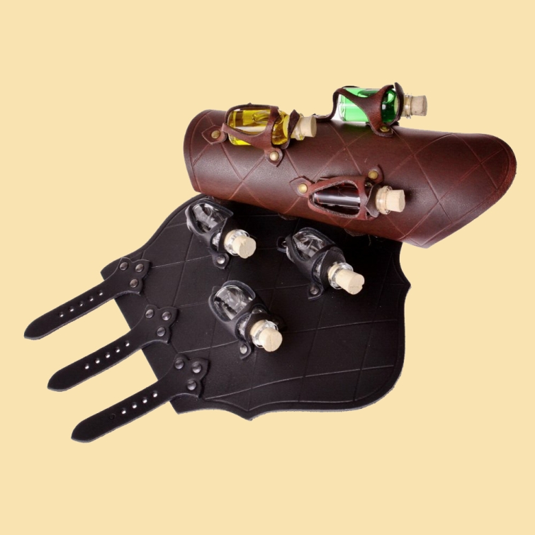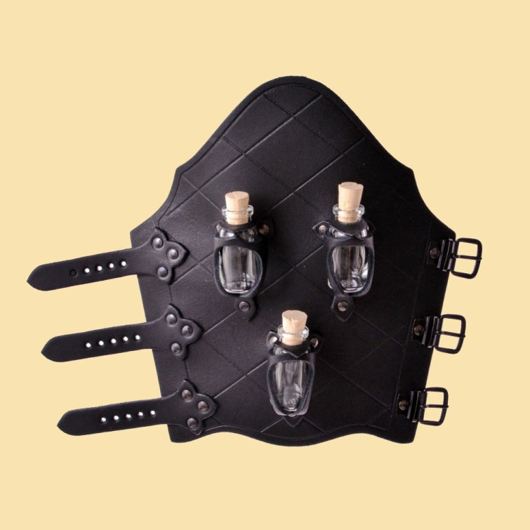 Armschützer mit drei aufgesetzten Trankfläschchen.