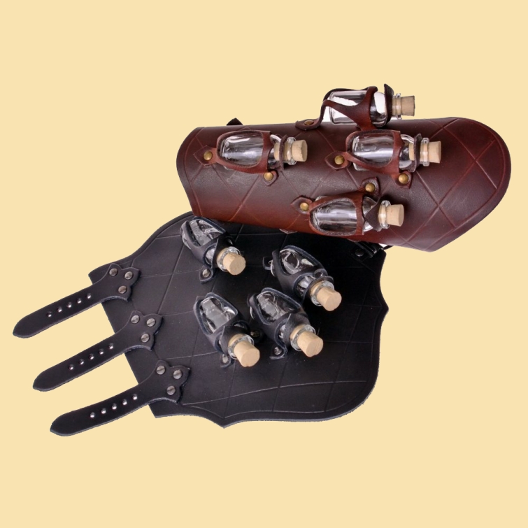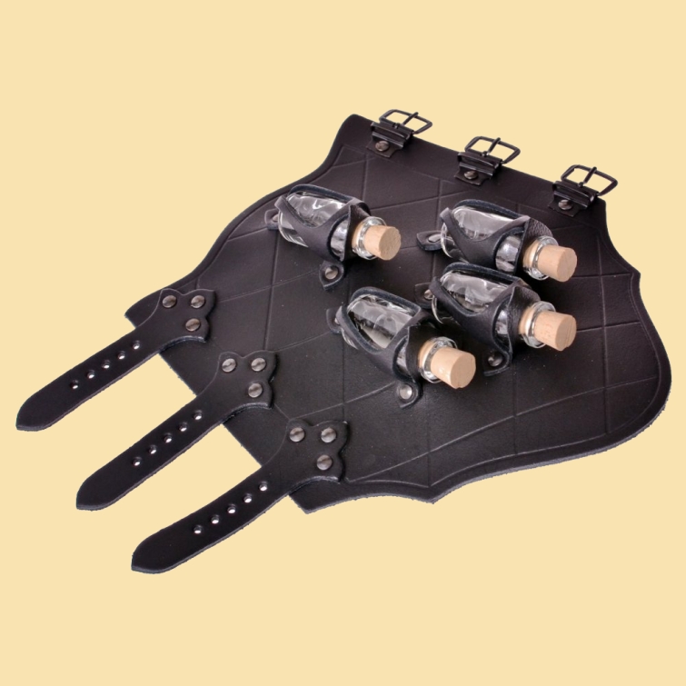 Armschützer mit vier aufgesetzten Trankfläschchen.