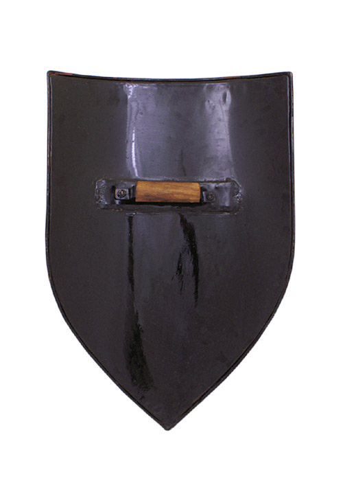 aus Stahl, welcher mit einer roten Korrosionsschutzfarbe behandelt wurde. Dieser Schildrohling kann somit leicht mit dem gewünschten Wappen oder Farben bemalt werden.