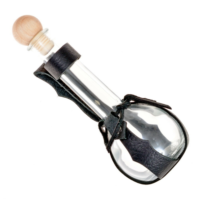 Die Glas-Feldflasche wird komplett mit Lederhalterung geliefert.
