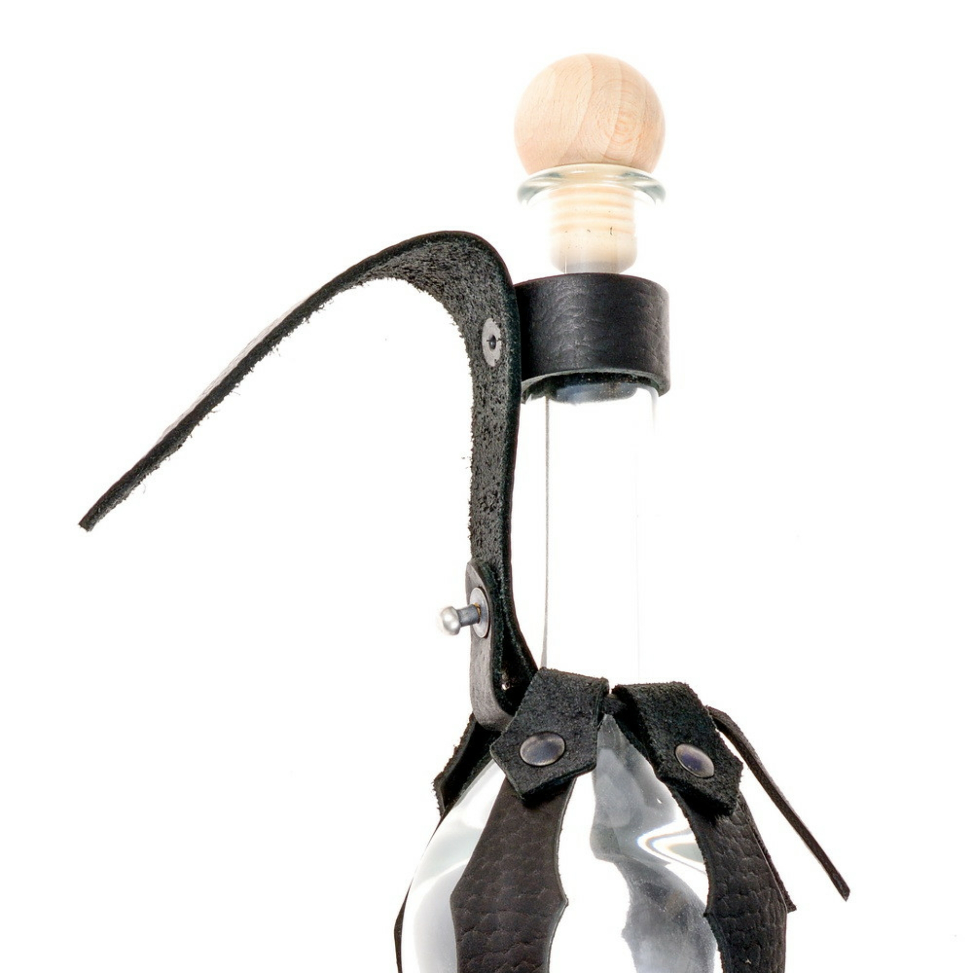 Der schlichte, aber schön geformte Flaschen-Halter aus schwarzem Leder