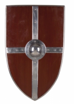 Kräftiger Holzschild mit Schildbuckel, Metallverzierungen und Stahleinfassung.