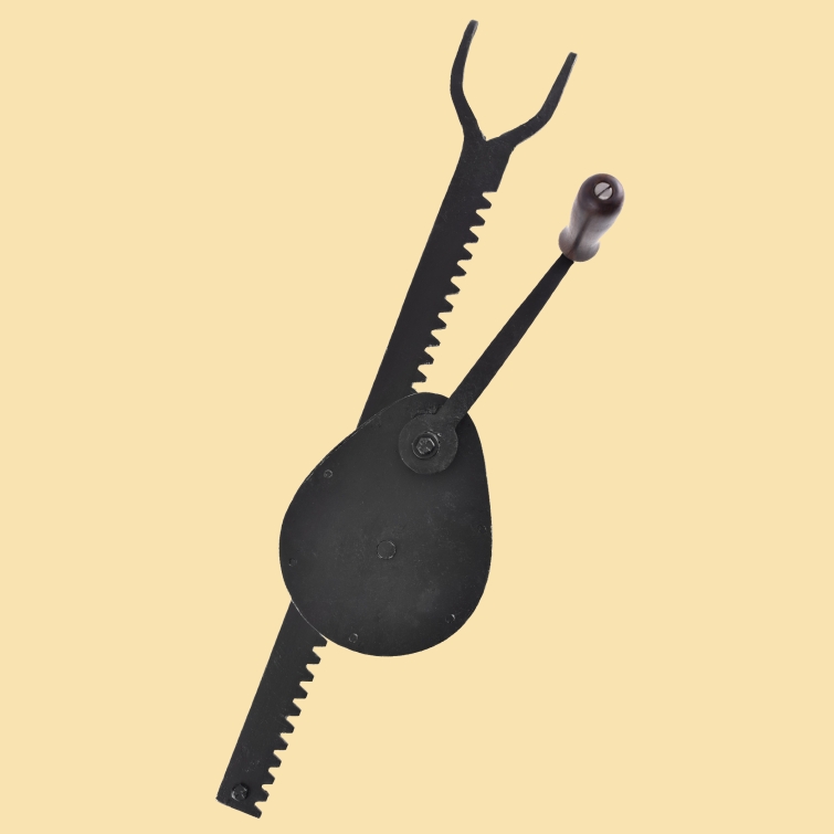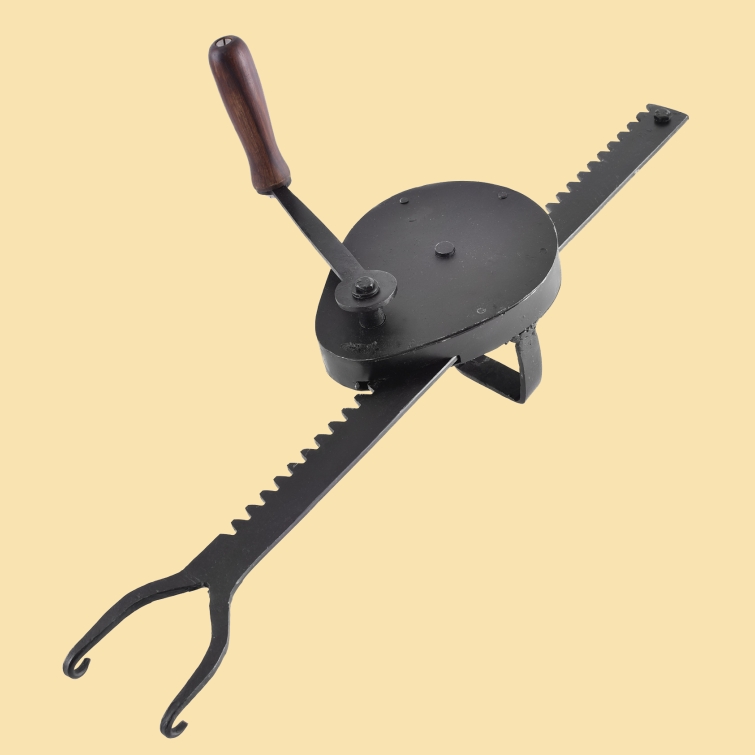 Eine metallene Winde, welche dazu genutzt wird, massive und schwer zu spannende Armbrüste zu spannen.
